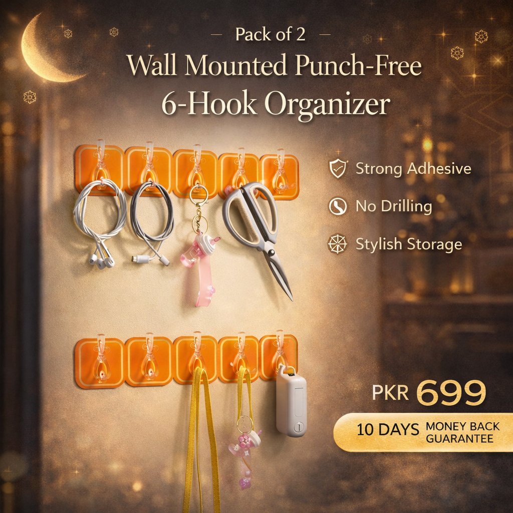 (Pack of 2) Wall Mounted Punch Free Strong Self Adhesive Stylish 6 Hook in Row For Home and Outdoor Use